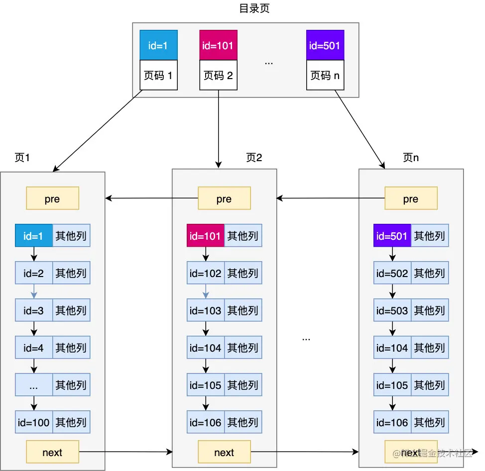 现在问题来了,如果有很多页,该怎么定位元素呢,如果元素刚好在前几个页还好,大不了遍历前几个页也很快,但如果要查 id = 100w 这样的元素一页页遍历的话就要遍历 1w 页(假设每页 100 条记录),那显然是不可接受的,如何改进呢,其实之前建的页内目录已经给了我们启发,既然在页内我们可以通过为记录建页目录的形式来先定位元素在哪个槽然后再找,那针对多页,能否先定位元素在哪个页呢,也就是说我们可以为页也建立一个目录,这个目录里的每一条记录都对应着页及页中的最小记录,当然这个目录也是以页的形式存在的,为了便于区分 ,我们把针对页生成的目录对应的页称为目录页,而之前存储完整记录的页称为数据页