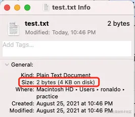 如图示,向磁盘写入了两个 byte ,但操作系统依然为其分配了一个页(4 KB)的大小