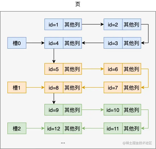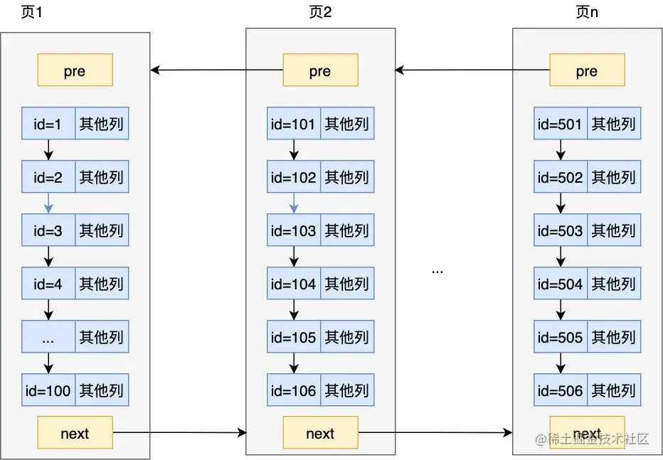 可以看到通过这种方式在页内很快把我们的元素定位出来了,MySQL 规定每个槽中的元素在 1~8 条,所以只要定位了在哪个槽,剩下的比较就不是什么问题了,当然一个页装的记录终究是有限的,如果页满了,就要要开辟另外的页来装记录了,页与页之间通过链表连接起来,但注意看下图,为啥要用双向链表连接起来呢,别忘了最开头我们列出的 「order by id asc 」和「order by id desc 」这两个查询条件,也就是说记录需要同时支持正序与逆序查找,这就是为什么要使用双向链表的原因