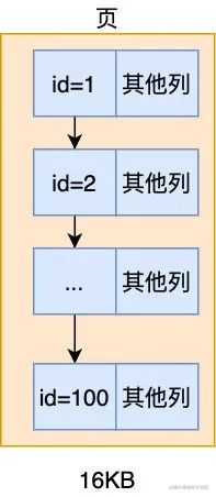 当然一次 IO 的读取记录也并不是多多益善,总不能为了一条查询记录而把很多无关的数据都加载到内存吧,那会造成资源的极大浪费,于是我们采用了一个比较折中的方案,我们规定一次 IO 读取 16 K 的数据,假设为 100 条数据好了,这样如果我们要查询 id = 100 的记录,只产生了一次 IO 读(id=1~id=100 的记录),比起原来的 100 次 IO 提升了 100 倍的性能