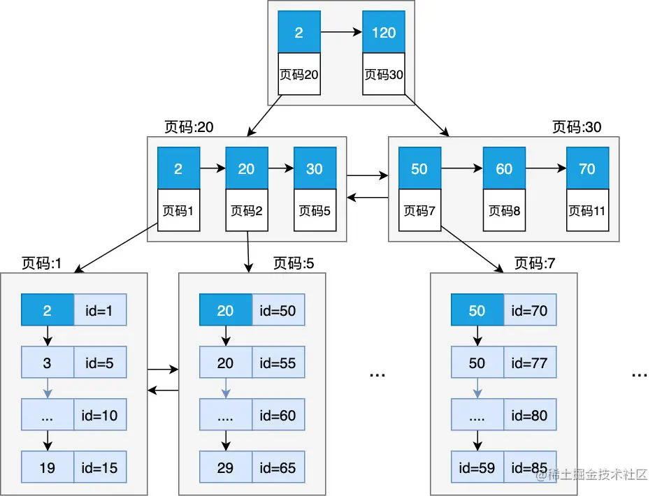 现在我们再来看一下如何查找 id = 55 的记录,首先会加载根节点,发现应该在页码 30 的页中去找,于是加载页 30,在页 30 中又发现应该在页 4 中查中,于是再次把页 4 加载进内存中,然后在页 4 中依次遍历查找,可以看到总共经历了 3 次 IO(B+树有几层就会有几次 IO),页读取之后会缓存在内存中,再读的话如果命中内存中的页就会直接从内存中获取。有人可能会问,如果 B+ 树层数很多,那岂不是可能会有很多次 IO,我们简单的算一下,假设数据页可以存储 100 条记录,目录页可以存储 1000 条记录(目录页由于只存储了主键,不存储完整的数据,所以可以存储更多的记录),那么