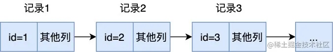 不知你有没发现我们在插入的时候并没有指定 id 值,但 InnoDB 为每条记录默认添加了一个 id 值,而且这个 id 值是递增的,每插入一条记录,id 递增 1,id 为什么要递增呢,主要是为了查询方便,每条记录按 id 由小到大的顺序用链表连接起来,这样每次查找 id = xxx 的值就从 id = 1 开始依次往后查找即可