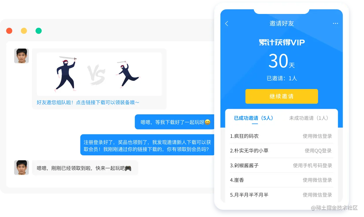 (3)自动增加社交关系。 老用户邀请新用户下载App进行互动。他们只需要通过携带参数的链接成功安装,双方就会自动添加到朋友好友/师徒,不需要手动搜索朋友身份证添加。