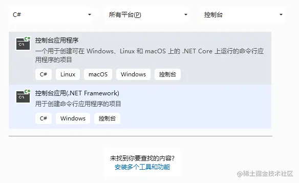 在卸载重装了了Visual Studio 2019 后我们看看创建项目。 创建一个控制台程序,如下图可以看到有两个选项,一个是.net Framework,一个是.net core上运行的。 不知道后面正式版VS2022会不会修改这个名称叫法,毕竟后面不再叫.net core了。