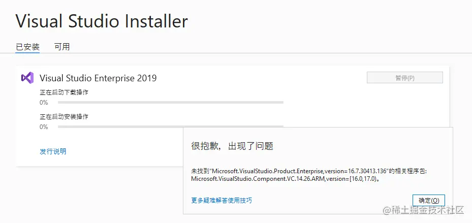 我本地已经安装了visual studio 2019 本来准备通过更新修改vs方式测试安装的。但是我本地环境vs有问题,一直报错。