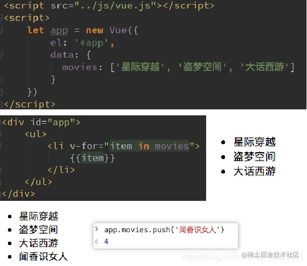 - 后面给数组追加元素的时候, 新的元素也可以在界面中渲染出来
