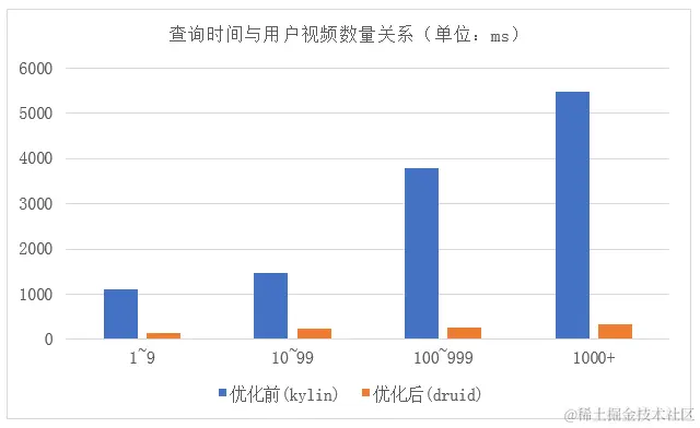 由上图可以看出,优化后自由时间选择的查询时长明显优于优化前,查询时长是数量级级别的差异。但当用户的视频量比较大时,Druid的查询性能明显下降,于是我们通过扩容集群机器等方式进一步解决用户视频量大而导致查询变慢的问题。