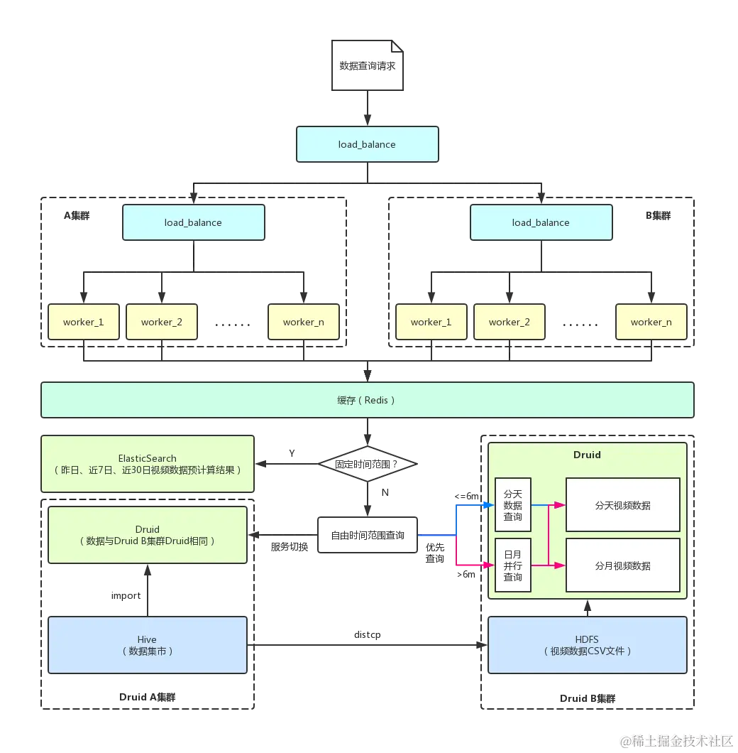 不同的业务场景需要不同的大数据技术架构,对于爱奇艺号而言,因单日数据量达到亿级且分固定时间选择和自由时间选择(至少查询近2年数据)查询数据的业务特点,因此采用的是 Druid和ElasticSearch的组合技术架构 ,其中自由时间选择查询Druid,而固定时间选择查询ElasticSearch。同时,为了保证数据的高可用,Druid和ElasticSearch都有主备2份数据。