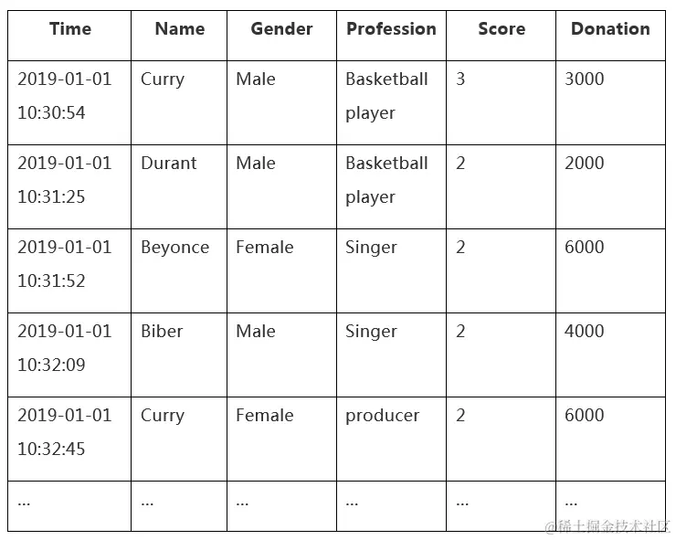 我们考虑如下场景,一场举世瞩目的篮球名人慈善赛在洛杉矶举行,所得善款全部用于公益事业,参加篮球赛的有现勇士球星Curry和Durant,著名歌手Beyonce、Biber,还有另外一名Curry女士参加等等。其中每人得分及相应捐款如下: