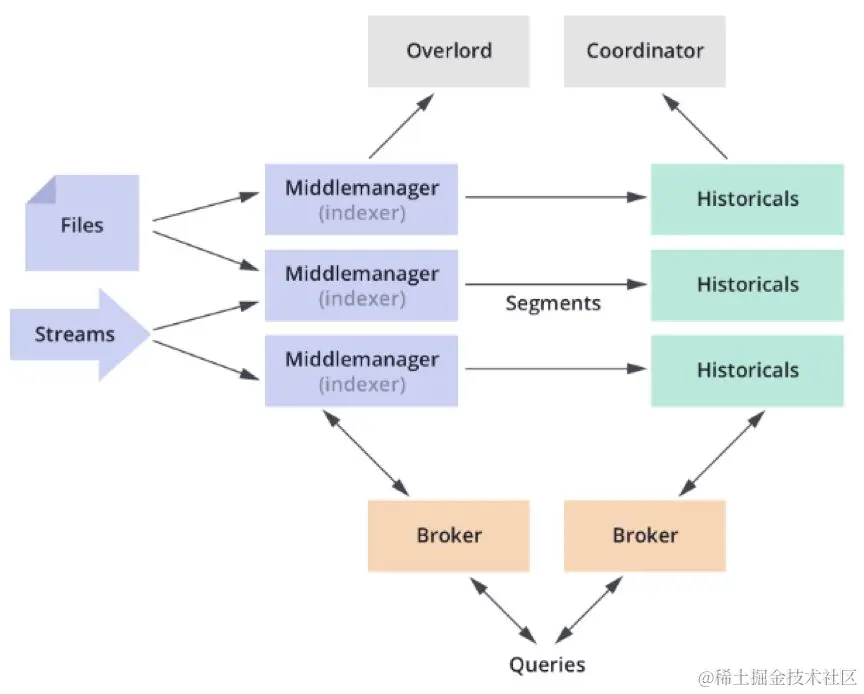 - Broker节点:对外提供数据查询服务,并同时从MiddleManager节点和Historical节点查询数据,合并后返回给调用方