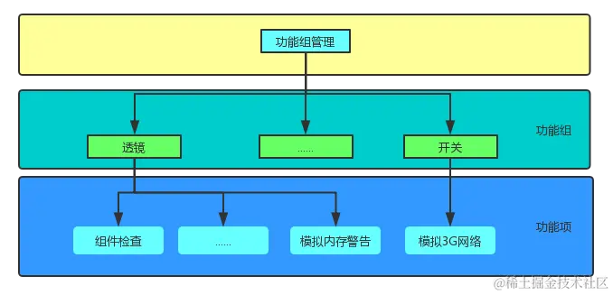 开关组添加了一系列和业务相关的开关选项,打开或者关闭的时候会强制走到程序逻辑的不同逻辑分支上,从而方便开发测试,产品验收。比如有些网络接口请求为了提高性能或者减少不必要的请求,不会每次都请求server数据,这会在开发或者测试阶段造成困难,而开关打开时可以强制请求这些接口,从而提高效率。\