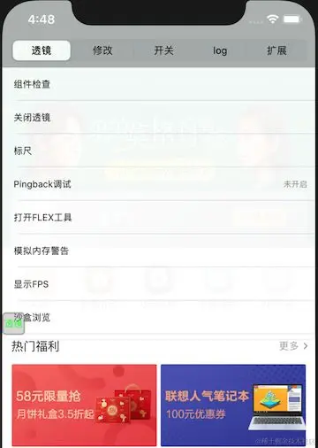 透镜是iOSApp在debug模式下集成在客户端上的一个工具集。它提供统一入口,为整个团队的不同角色提供服务,以提高其工作效率,降低一些操作的成本。透镜也吸纳了一些有益的开源库的部分功能,比如 Flex和 DoraemonKit,并针对业务做了优化调整,以满足团队需求。\