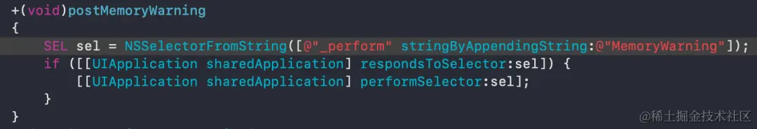 在模拟器上很容易模拟内存警告,但是真机却没有这个功能。系统私有api提供了模拟内存警告的方法,调用系统私有api可以模拟内存警告从而调试一些异常情况。庆幸的是不需要把这部分代码带到Appstore,以免App被拒。\