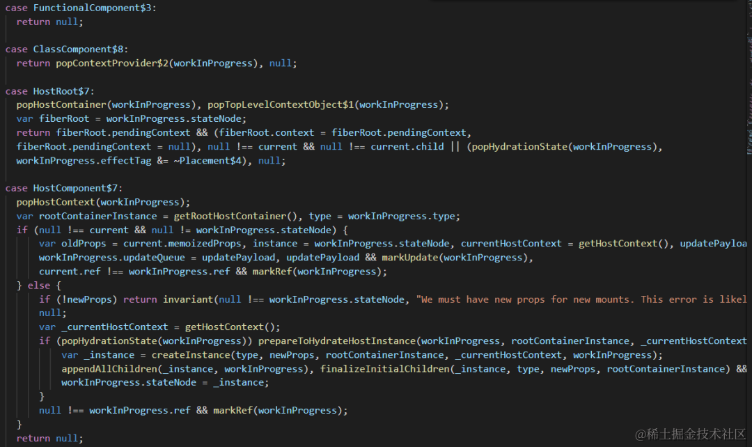 在处理节点过程中,如果遇到节点的子节点为空,那么就会调用completeUnitOfWork函数。该函数根据节点类型进行相应处理: