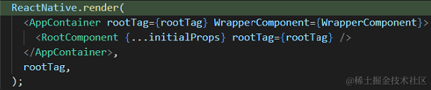 其中Index是需要渲染的根控件,runApplication函数会调用ReactNative.render函数,将业务的根节点包裹在AppContainer控件中传递给该函数:\