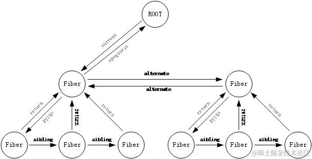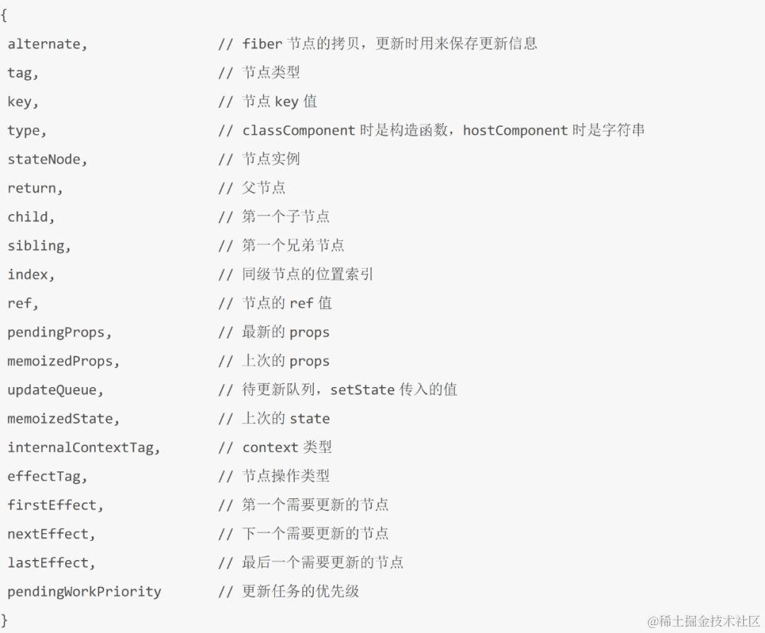每一个控件都会对应一个fiber对象节点,所有的fiber节点就构成了virtualdom树,fiber对象的结构和表示的意义如下:\