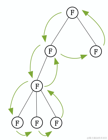 如果nextUnitOfWork不为空,就对其进行处理,否则执行completeUnitOfWork,然后依次遍历处理该节点的兄弟节点和父节点的兄弟节点,直到父节点为空,循环结束。不难发现RN是按照深度优先来创建和更新节点的。具体的创建顺序如下图所示:\