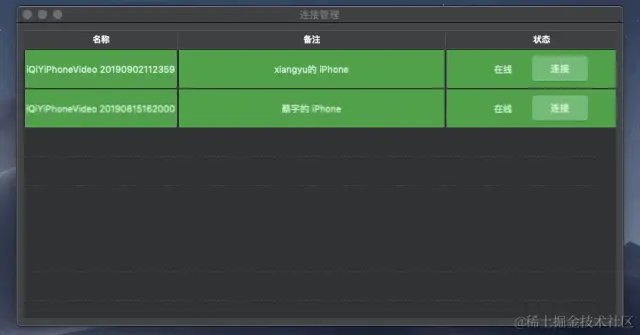 启动后,该工具会自动搜索发现局域网内的客户端,分别显示客户端App名称、版本、设备标识及连接状态等信息,并自动维护连接状态,如下图: