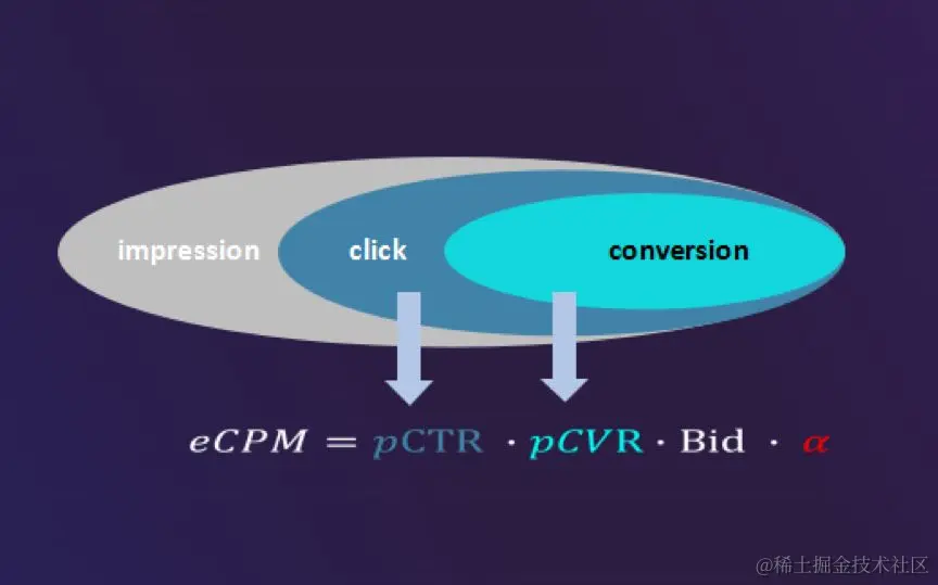 粗、精排的排序逻辑依照 eCPM ( effective Cost Per Mille ),也就是千次展示平台的预期收益来排序,其计算公式如上图所示,eCPM=点击率×转化率×出价×智能出价因子。\