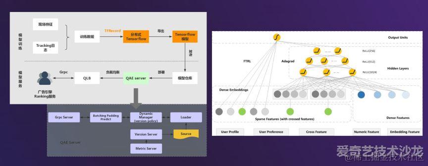 为了提高模型准确率和泛化能力,上线了深度学习,当前采用的是 Wide&Deep 的模型,并进行了离线模型调优和线上性能优化,以满足广告场景下对高 QPS 以及高稳定性需求。\