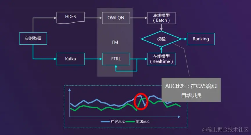 天下武功唯快不破,时效性对模型来说是非常重要的。当前线上使用的基于 FTRL 的 FM 模型,实时消费线上 Kafka 流的数据,分钟级进行模型更新。由于线上模型是分钟级更新,线上要有一套监控体系,一旦线上指标出现异动,比如上图举例的 AUC 低于离线分天训练的备用的模型,会进行线上模型与备用离线模型自动切换。\