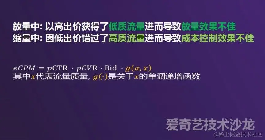 上面介绍了基础版本的智能出价方案,但这样会产生一些问题,比如放量过程中的订单,可能以高价格获得了低质的流量而导致效果不佳,反之可能错过高质量流量。解决方法是做流量粒度下的智能出价,即考虑成本的同时也考虑流量质量,就是上图g函数,考虑成本参数的同时也加入流量质量参数。\