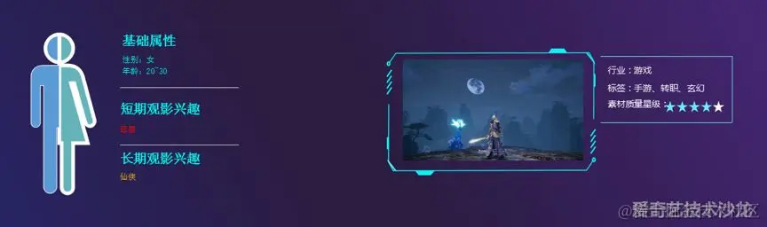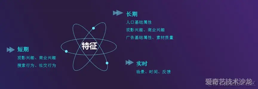 - 长期特征有人口基础属性(性别年龄等)、观影兴趣、商业兴趣、广告基础属性(所处行业等)和素材质量等。这里的观影兴趣,依然举上图例子,这位女性用户可能喜欢参与仙侠类的讨论,喜欢出现在仙侠剧中的偶像等等,所以针对这位用户打得长期观影兴趣的标签是仙侠。