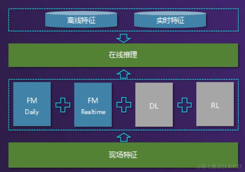 2. 第二步进入模型训练,会有 FM 分天模型、FM 在线学习、深度学习和强化学习等。