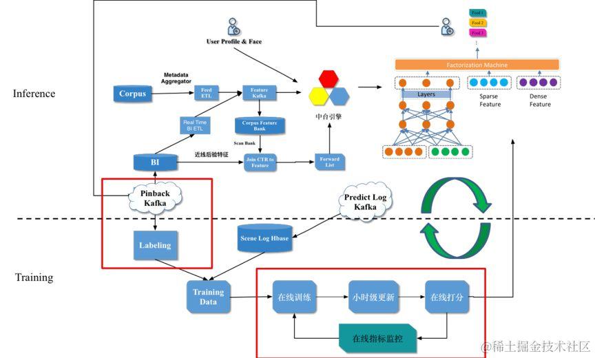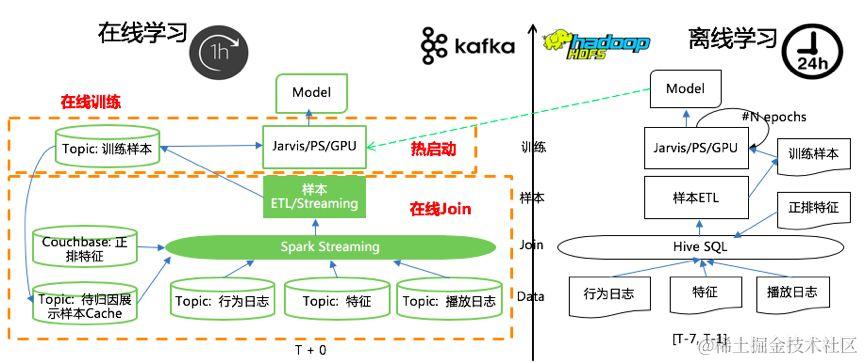 - 数据实时化:在线学习的数据流从用户行为数据到模型训练样本的生产都是在线进行的,实现了样本、特征和时长数据的在线Join, 数据流都通过Kafka 向后传递;