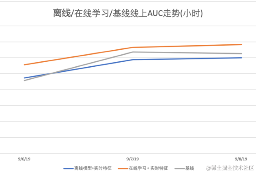 在图文信息流推荐产品上,我们论证了实时特征+在线学习的组合更能发挥出实时特征的最大化效果。下图是三个实验的多天在线AUC走势,可见实时特征+在线学习的AUC明显高于基线,优于实时特征+离线训练的组合。