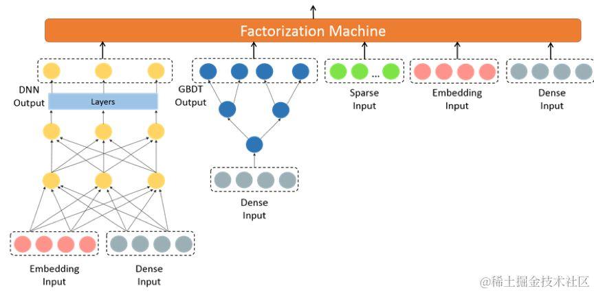 这是一个W&D模型变种,但是Wide侧和Deep侧是各自经过一个FM后再进行结果融合: