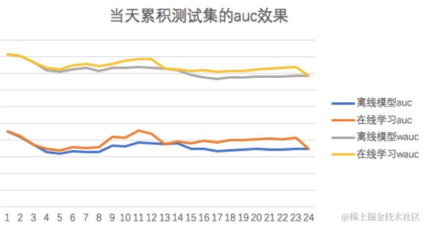 下图给出了短视频信息流产品推荐当天累积测试集的离线模型和在线学习每个小时推出的在线模型的auc/wauc对比,在线学习在当天测试集上表现优于离线模型。