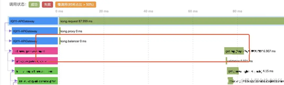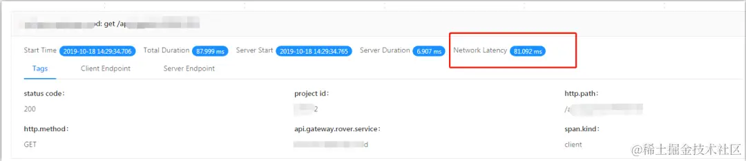 此外 API 网关在消息转发阶段进行了埋点并接入了调用分析系统,开发者可通过分析消息调用链,根据慢响应详情进一步分析问题。以下图为例,开发者排查慢请求过程中,通过调用链分析发现耗时较大处标记是网络延迟。在进一步查看客户、服务端区域后发现,该请求为跨机房调用,服务部署在单个机房导致了该请求时延较高,开发者以此为依据对服务部署进行了调整。