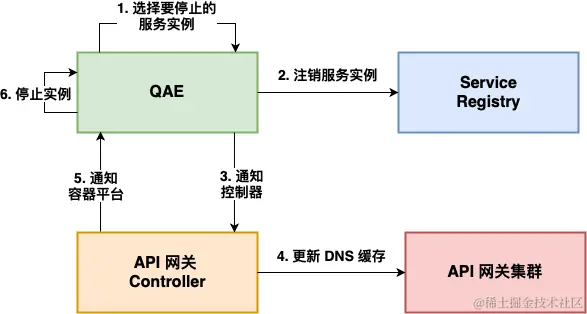 请求进入 API 网关时,Kong 通过 DNS 向 Service Registry 查询服务实例列表,作为请求转发的 upstream。由于 DNS 缓存机制,需要在实例变更时及时清理缓存,确保请求访问至有效的实例。尤其是在私有容器平台 QAE(iQIYIAPP Engine)环境中,访问地址随实例变更而变化,为尽可能保证服务解析成功,系统之间需要完成一些联动。以QAE 缩减应用副本数操作为例,过程大致如下图所示。