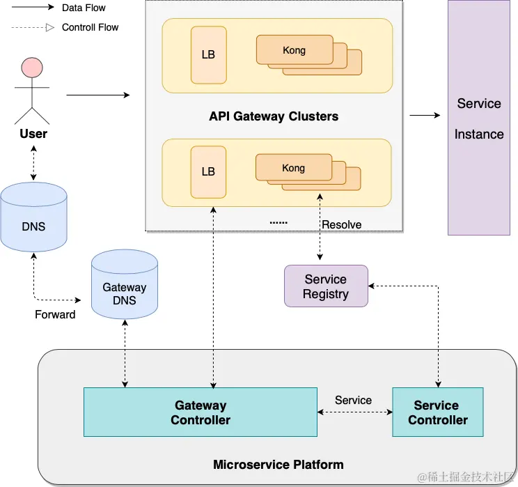 API 网关采用靠近客户端的分布式部署方案,在各地区部署独立集群并就近解析;单个 API 网关集群通过负载均衡服务暴露。API 配置需要在多个集群内维护,因此爱奇艺技术团队开发了 API 网关控制器,统一负责集群管理、域名创建、DNS 绑定等操作,整体架构如下图所示。