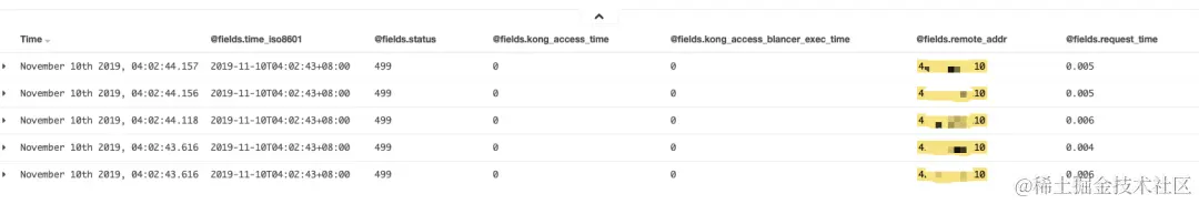 API 网关提供了监控、报警、日志、调用分析等功能,可帮助开发者完成问题排查。通过接入日志系统,方便开发者筛查日志,以下图排查 499 问题为例,通过筛选发现,短时间内该接口被某外网 IP 频繁访问且请求时间较短,鉴于 nginx 499 状态码表示客户端主动断开连接,判断为疑似外网攻击。