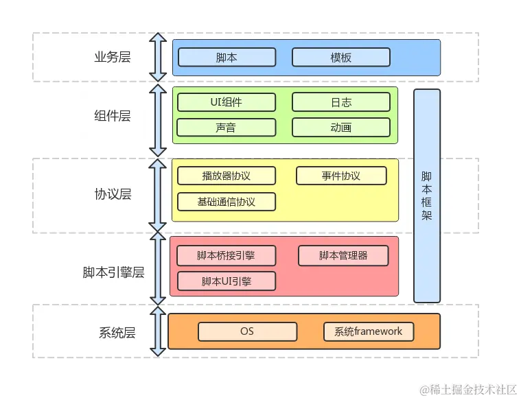 脚本框架通过通信栈的数据结构实现了针对于不同移动端操作系统的桥接引擎,并实现一个脚本的加载和管理模块,基于引擎层封装了若干可供组合与扩展的基础协议,包括控制播放器的协议,自定义事件的协议和可扩展的通信桥接协议,便于今后版本的向下兼容。
