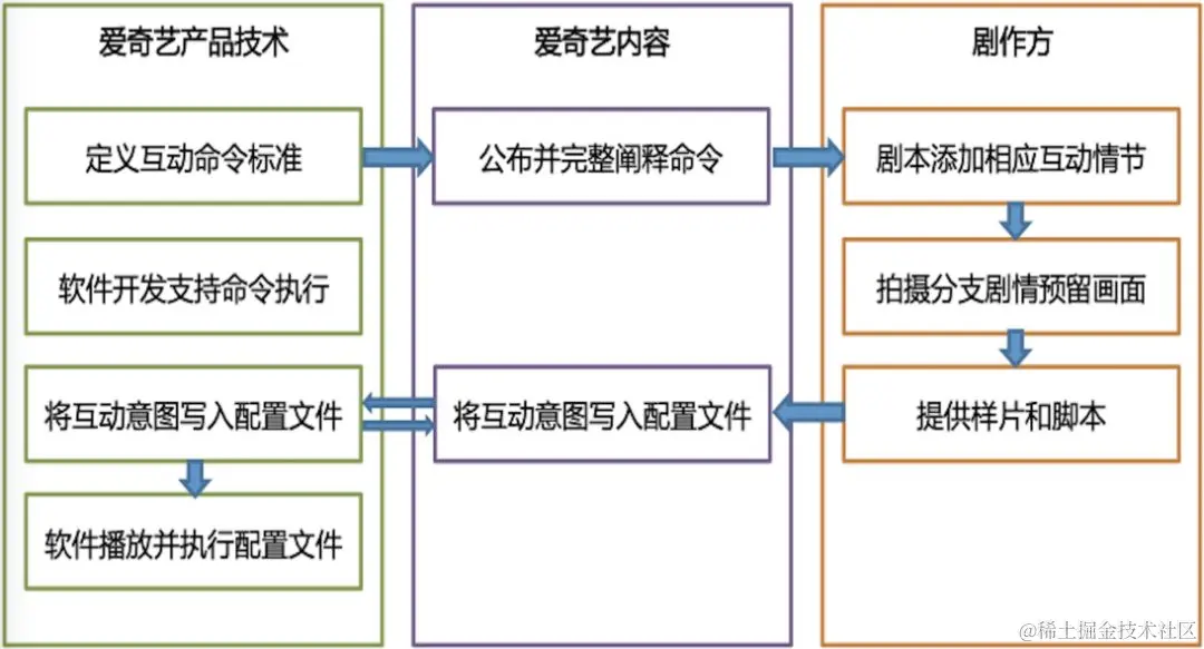 爱奇艺定义了一套互动剧的交互协议与命令标准,并搭建了整套协议的交互流程,下发流程,配置流程,并将封装后的的标准提供给剧作方,便于其进行内容的制作和上传。
