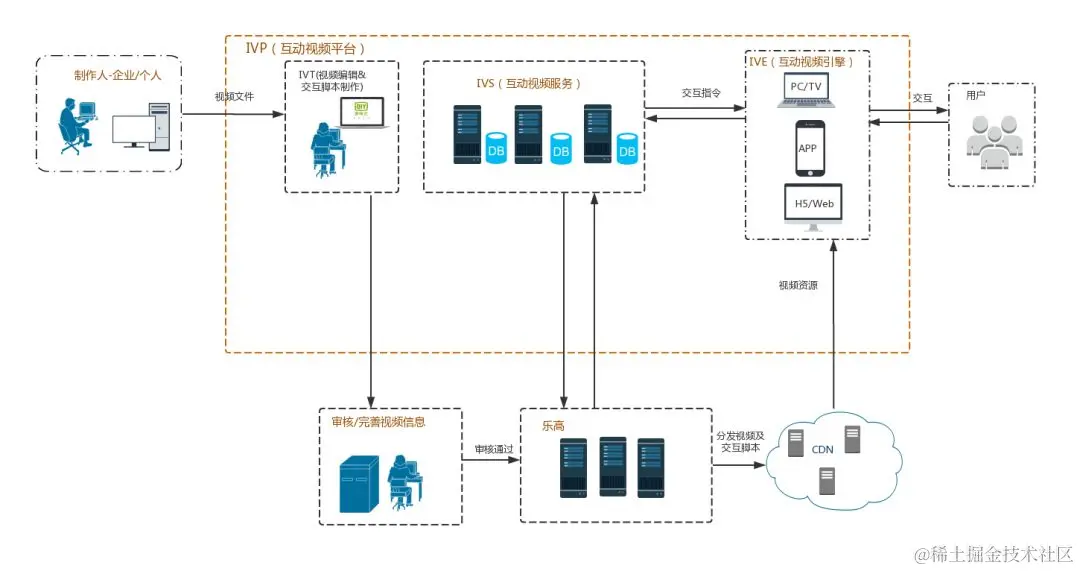 如上图所示,视频互动体系技术框架,即互动视频平台(IVP)主要包括视频编辑以及交互脚本制作前端(IVT)+互动视频服务后端(IVS)+互动视频引擎(IVE)三部分组成。其中IVT的部分目前与爱奇艺视频录入系统结合较为紧密,目前是跟爱奇艺视频录入系统整合在一起的。