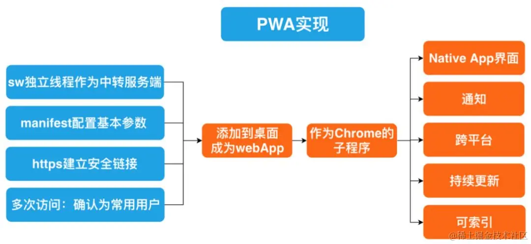 早期应用的实践都是为了同样的课题:如何用Web技术来开发原生应用,如Electron、Cordova、React Native。PWA则更进一步:直接用Web技术本身实现原生应用的体验。