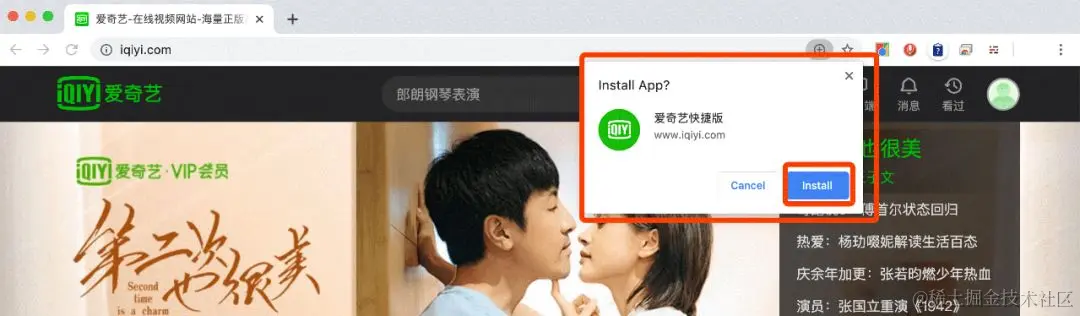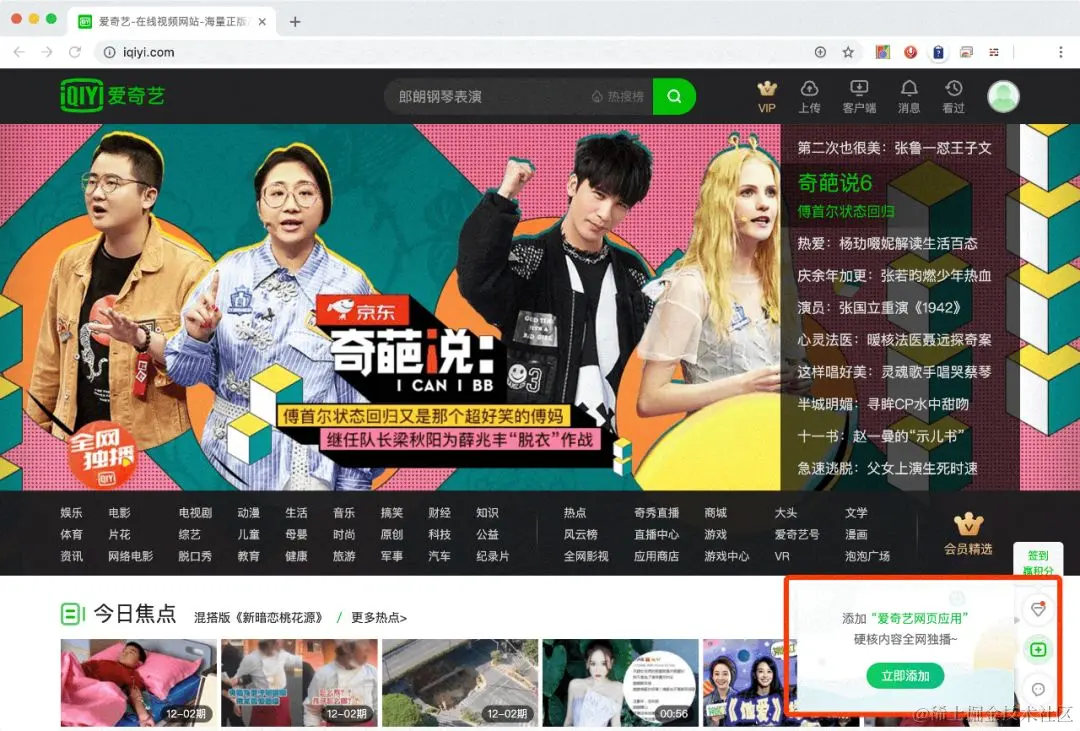 在访问爱奇艺主站首页时,页面右下角会有一个加号图标,鼠标放在该处会显示一个安装弹层,如下图: