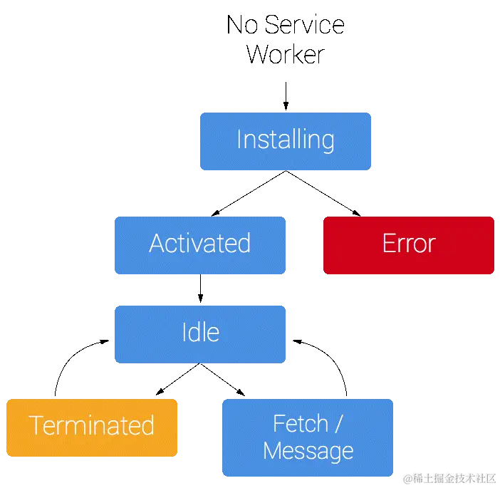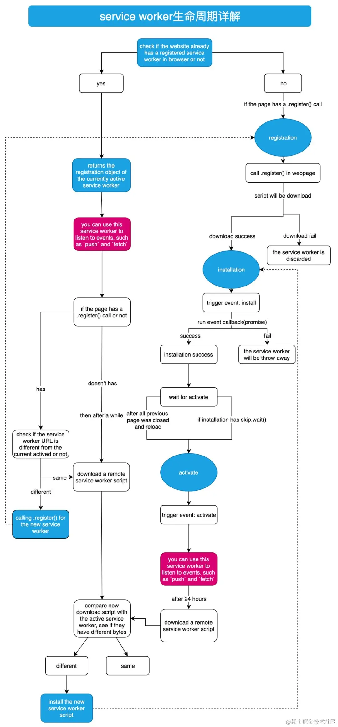 下图则是一个Service Worker更为详细的一个生命周期过程,供大家了解Service Worker的运行过程: