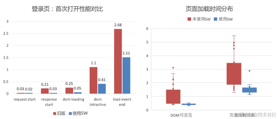 从图中我们可以看出:从response start开始的网络响应时间明显降低。更为重要的是,从右侧的“页面加载时间分布”图可以看出,使用Service Worker后页面加载时间非常稳定,网络波动对于页面加载造成的影响很小,这对于用户的实际体验会有明显的加分。