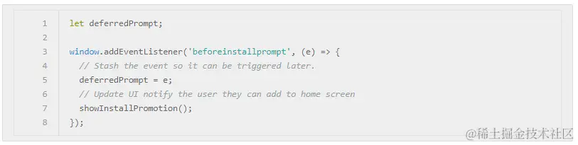 当以上条件都满足后,Chrome会触发beforeinstallprompt事件,我们便可以通过监听该事件来实现安装提示的弹出。