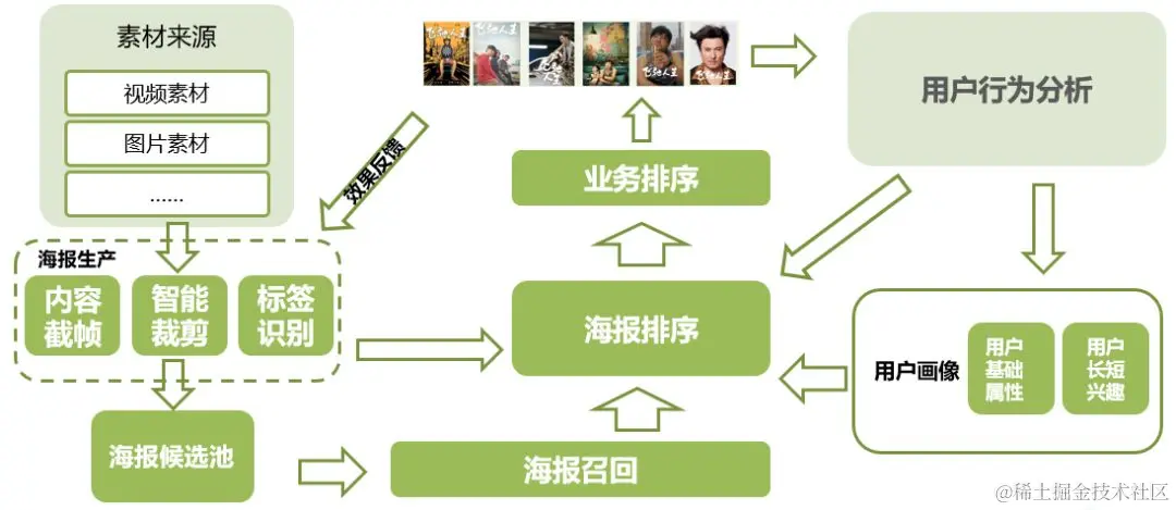 海报的线上分发模块与传统的视频推荐类似,对需要展示个性化海报的视频进行海报维度的召回、排序以及业务策略,最终为用户推荐最优的个性化海报。下文将详细介绍在AI海报制作、个性化海报分发以及线上实践效果。