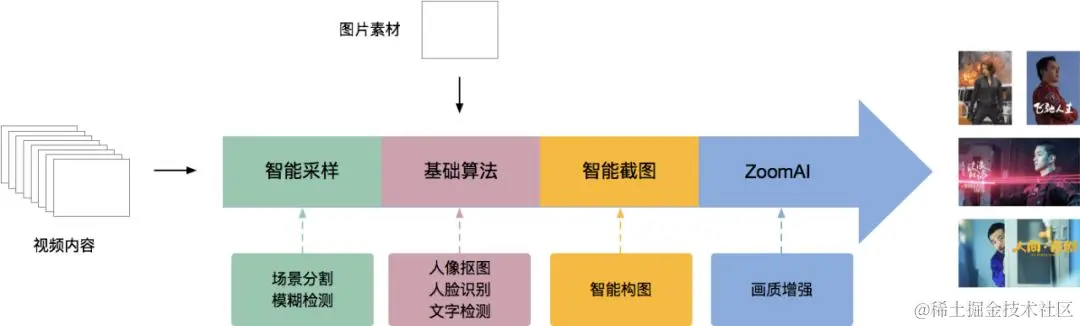 基于图片的智能检测,我们将海报生成算法分为了几个模块,分别是基础算法、智能截图、智能LOGO叠加、ZoomAI智能增强技术,具体如下: