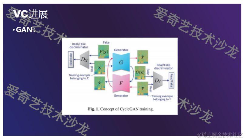 在这个领域中, GAN可以用于平行语料和非平行语料的VC。有两篇比较知名的文章运用了用GAN来做VC,一个是CycleGAN,另一个是StarGAN。StarGAN在CycleGAN之后发表并引入了更多的条件,可以做多到多的变换。下面简单介绍一下CycleGAN的结构, GAN包含一个生成器、分类器,CycleGAN把真实的数据X通过一个生成器换成了Y,这是它的第一次的生成过程。另外,在整个机制中还需要再完成一次——将即生成的Y送入另外一个生成网络后,再还原回X,保证即生成的Y是能够还原X的,保证第一个生成器转换之后还包含的足够信息能够还原回X,从而起到环,即Cycle的作用,所以他叫CycleGAN,图中的(DX、DY)是分类器。
