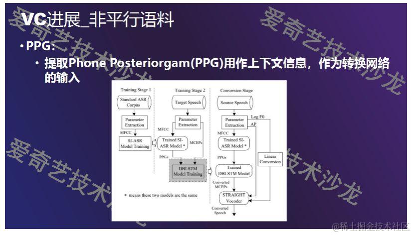 PPG的大致训练流程如下:第一阶段相当于训练一个ASR,这是与说话人无关的一个ASR。得到这个ASR模型后,第二个阶段开始训练转换网络,这个转换网络比较简单,它用了一个比较深度的LSTM,输入ASR识别出来的PPG,目标就是梅尔参数。在PPG中,先把我们这个模型转化成对应的梅尔参数,梅尔参数再交由声码器去进行合成,比如原始文章中所用的STRAIGHT声码器。