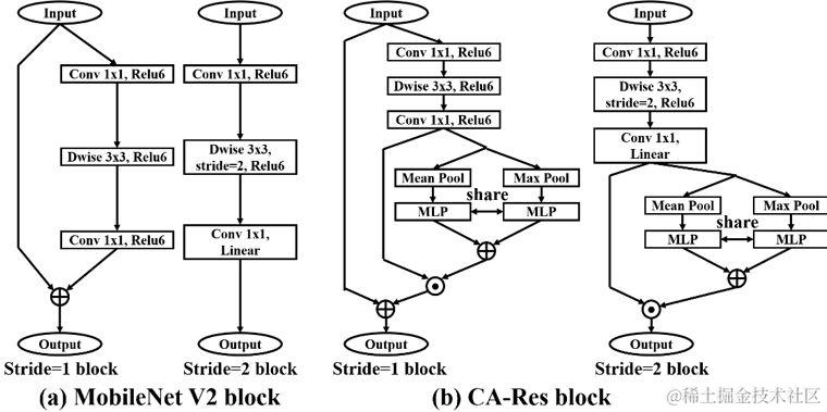 MobileNetV2 作为一种轻量级网络结构(如表 3(a)所示)在较大提高的网络的紧凑性的同时,损失了部分精度。作者在 MobileNetV2 的基础上提出了一种 CA-Res block 结构,具体如表 3(b)所示,利用这种网络结构训练的模型比之前的方法快 206 倍。