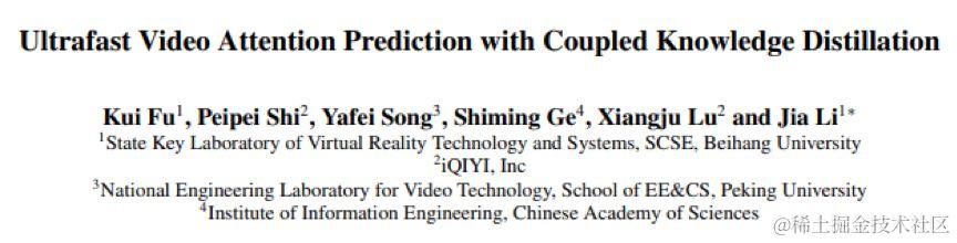[1]Fu, K., Shi, P., Song, Y., Ge, S., Lu, X. & Li, J. (2019). Ultrafast Video Attention Prediction with Coupled Knowledge Distillation. In AAAI, 2020.
